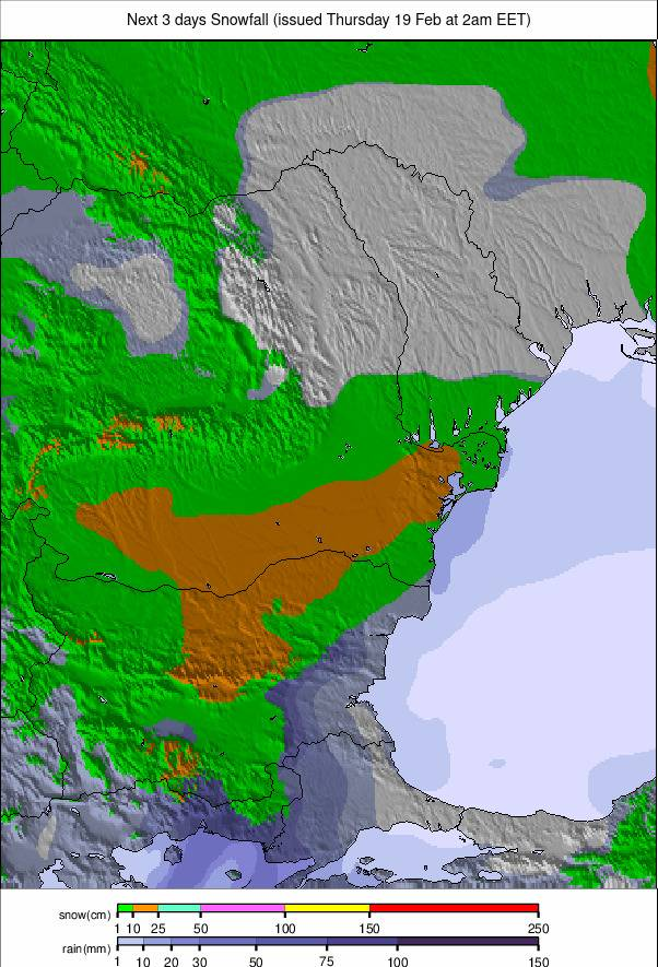 Predominantly cold with a mix of light snowfall and brighter spells. Light snow showers forecast intermittently, especially in Bulgaria and Slovakia.